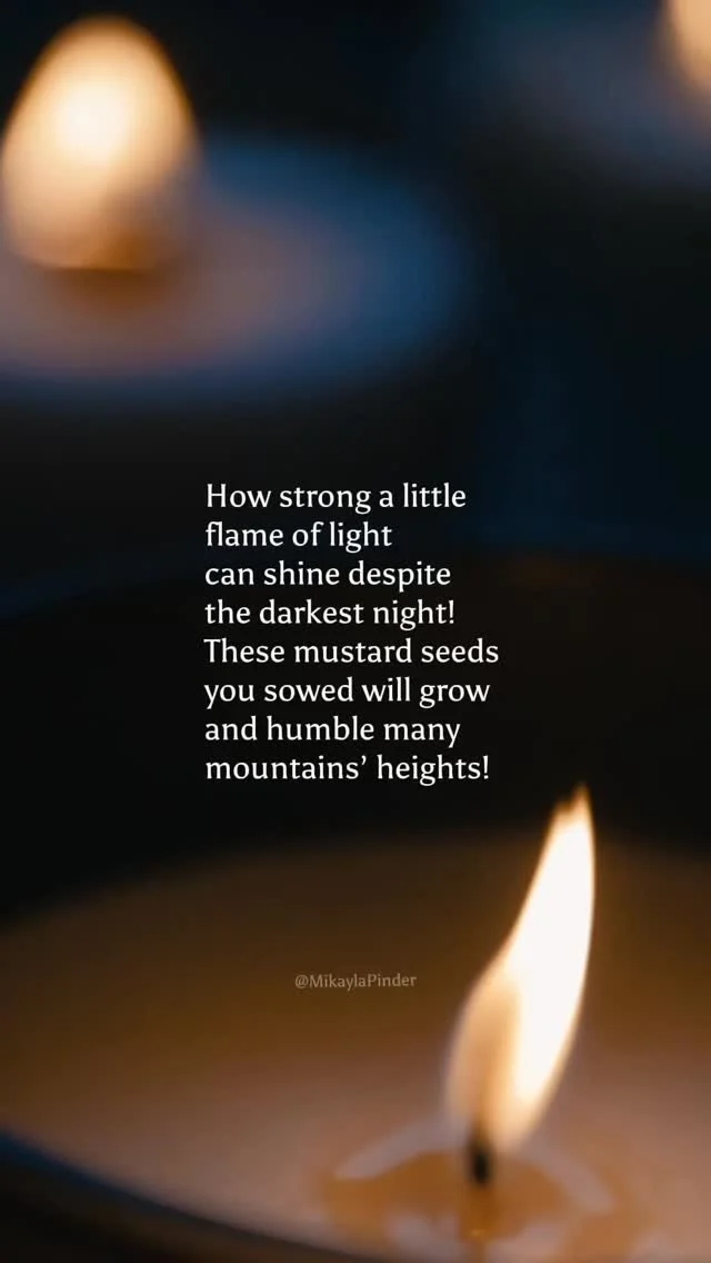 How strong a little flame of light can shine despite the darkest night! These mustard seeds you sowed will grow and humble many mountains’ heights!