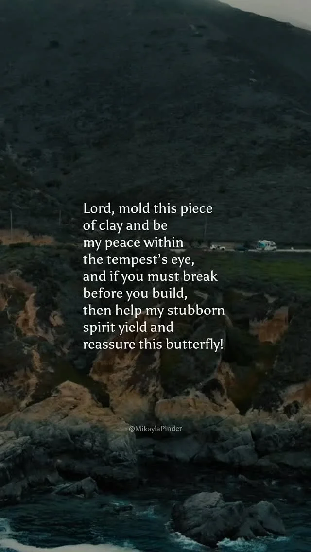 “Lord, mold this piece of clay and be my peace within the tempest’s eye, and if you must break before you build, then help my stubborn spirit yield and reassure this butterfly!”